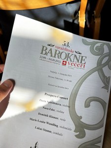 Nakon doručka uputili smo se u Trakošćan na barokni koncert u samome dvorcu, koji je zapravo i bio razlog ovog brzog jednodnevnog izleta. U sklopu festivala Varaždinske barokne večeri švicarski ansambl Prospero consort održao je svoj koncert pod nazivam „koncert uz baroknu kavu”. Ugođaj je bio fenomenalan. Sama činjenica da je koncert bio održan u prostorijama jednog od najljepših dvoraca u Hrvatskoj daje potpuni barokni doživljaj. Jedan od partnera festivala je i Intistitut Liszt Zagreb koji je tu svake godine, a 2017. godine su bili i partnerska zemlja. Također u subotu, zadnjeg dana rujna, Judit Andrejszki i Szilvia Takács su održali divan koncert u Županijskoj Palači na otvorenom. Uživalo se u Arijama.
