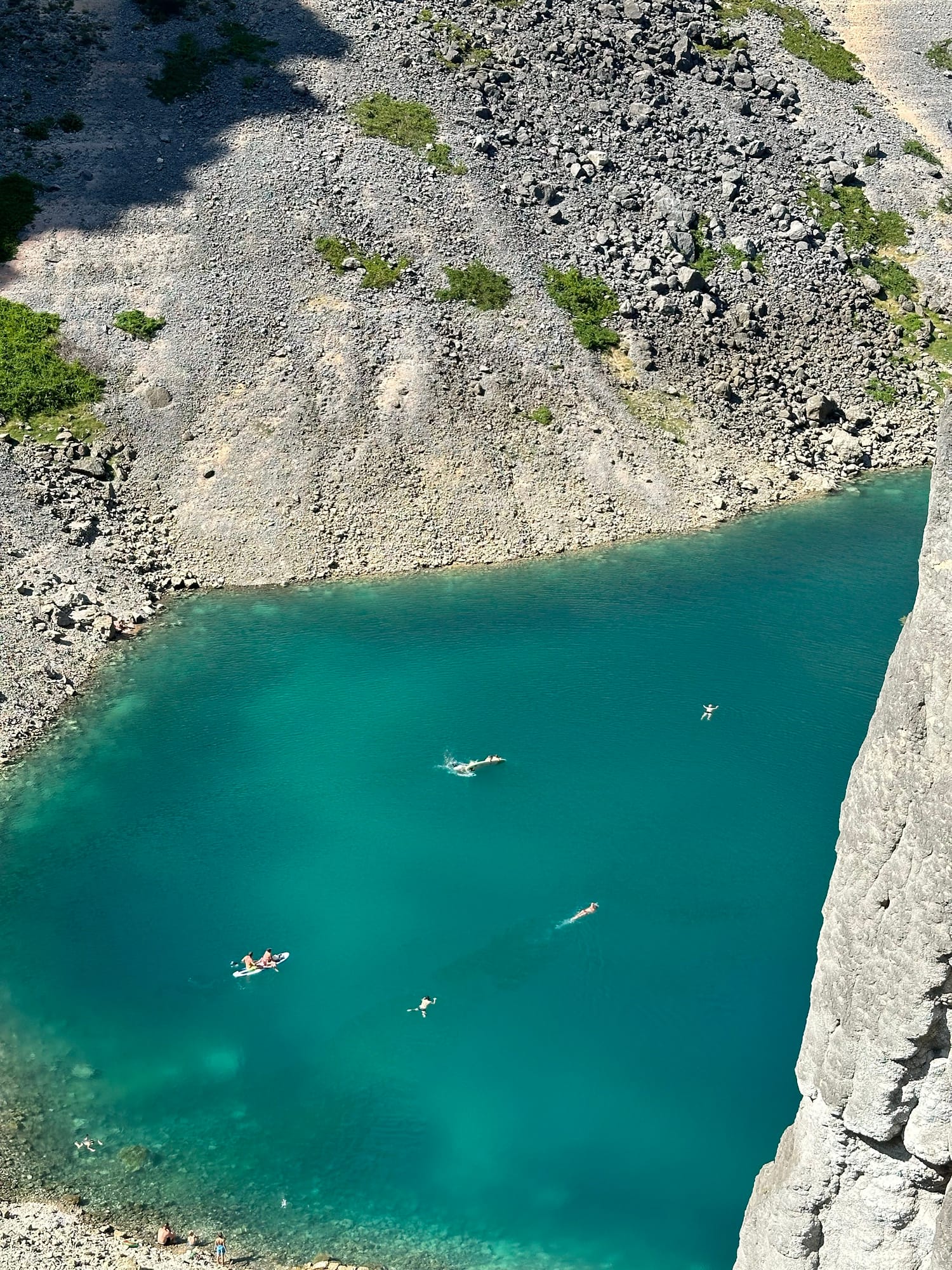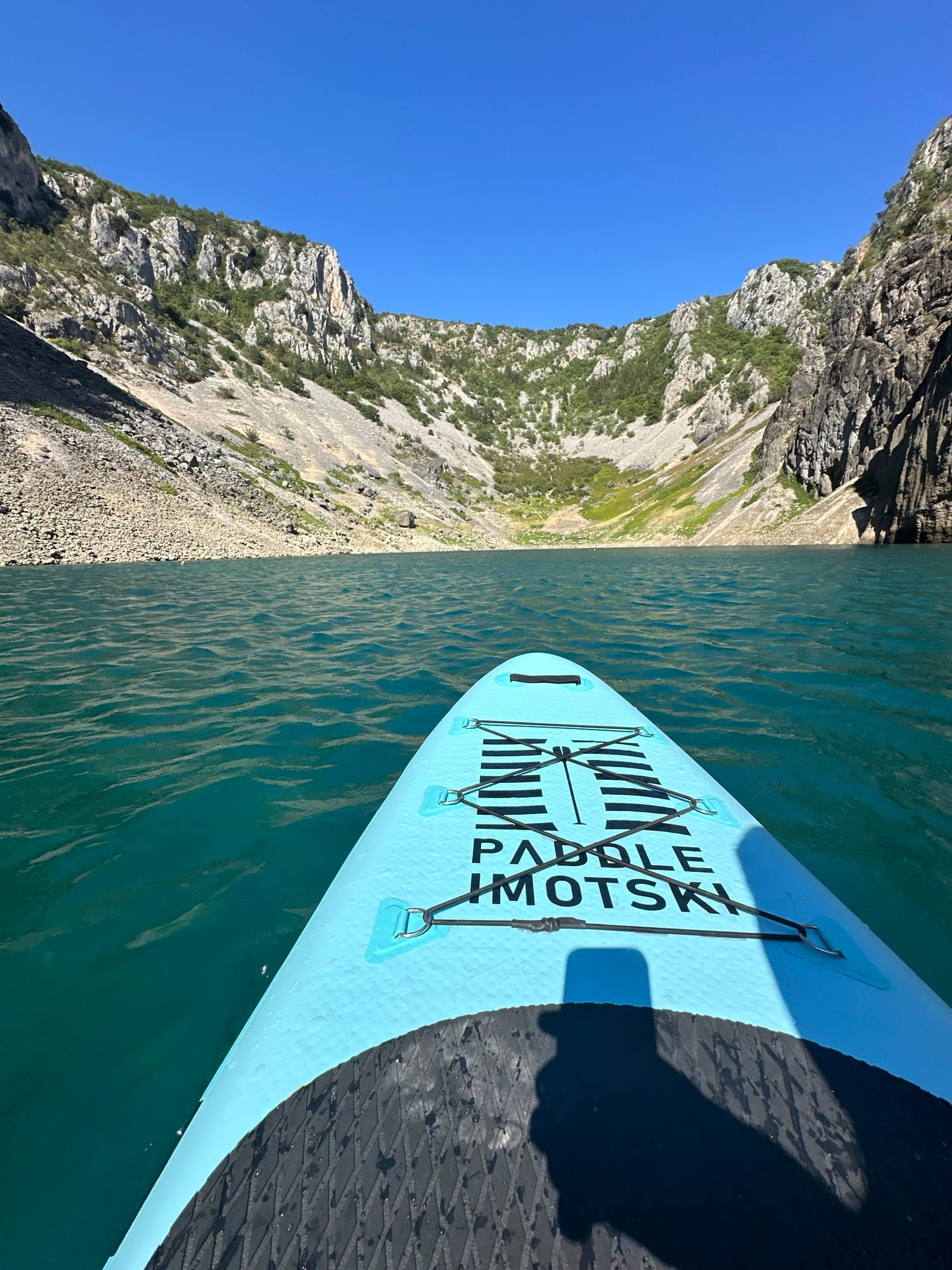 Nakon uzbudljivog jutra na Vrljici i 3 sata veslanja, uputili smo se prema Modrom jezeru koje mi je želja bila posjetiti već duže vremena, a ujedno je i jedno od najpoznatijih prirodnih fenomena u Hrvatskoj. Modro jezero smješteno je svega nekoliko minuta hoda od centra Imotskog, ako dolazite autom možete se ovdje parkirati. Jezero je poznato po svojoj dubokoj plavoj boji koja se mijenja ovisno o godišnjem dobu i razini vode. Tijekom ljeta, jezero se povlači, otkrivajući fascinantne formacije stijena. Naša paddle boarding avantura na Modrom jezeru bila je iskustvo koje ćemo dugo pamtiti – kliziti po njegovoj površini dok nas okružuju impresivne litice, zaista je neponovljivo.