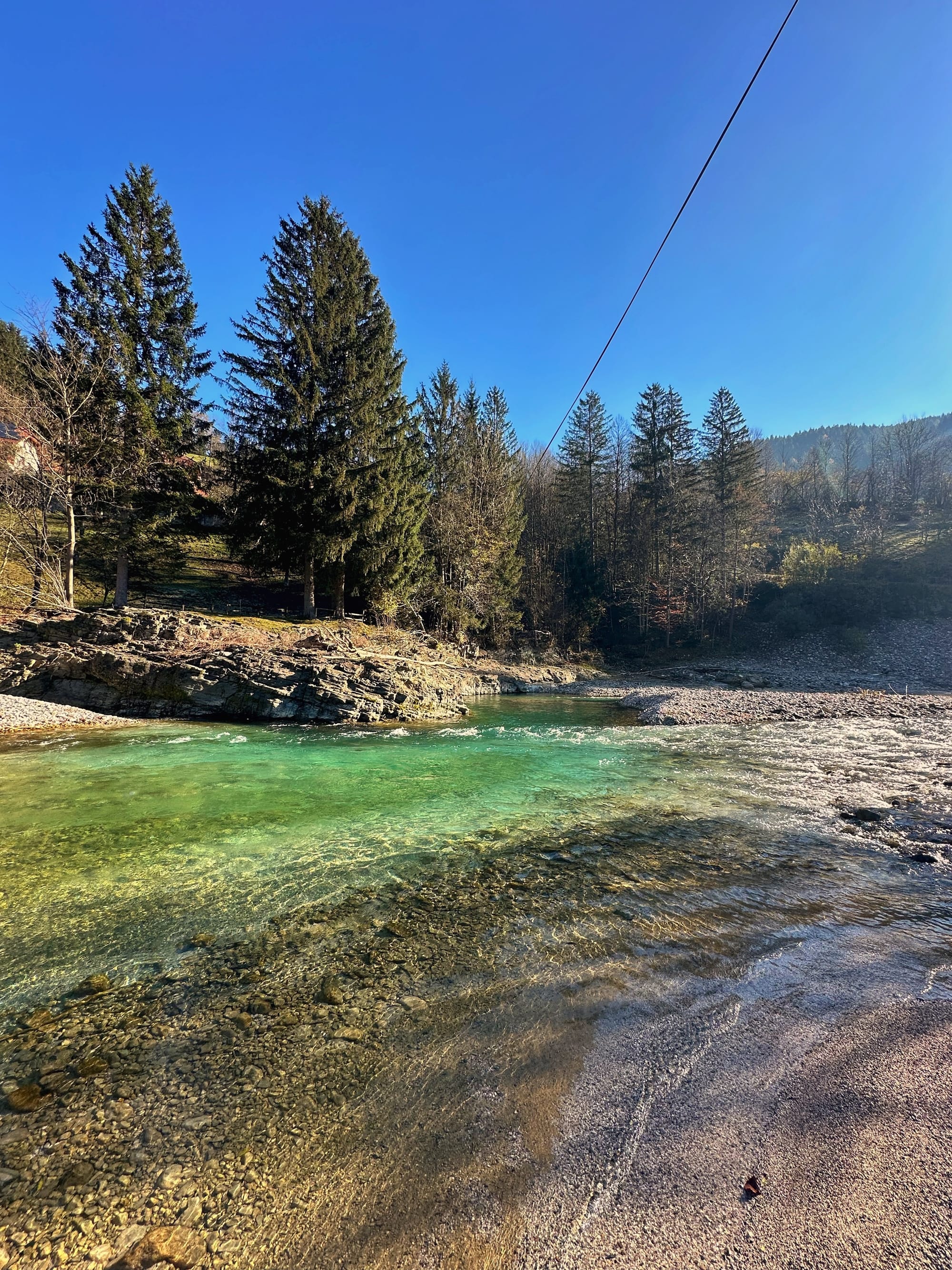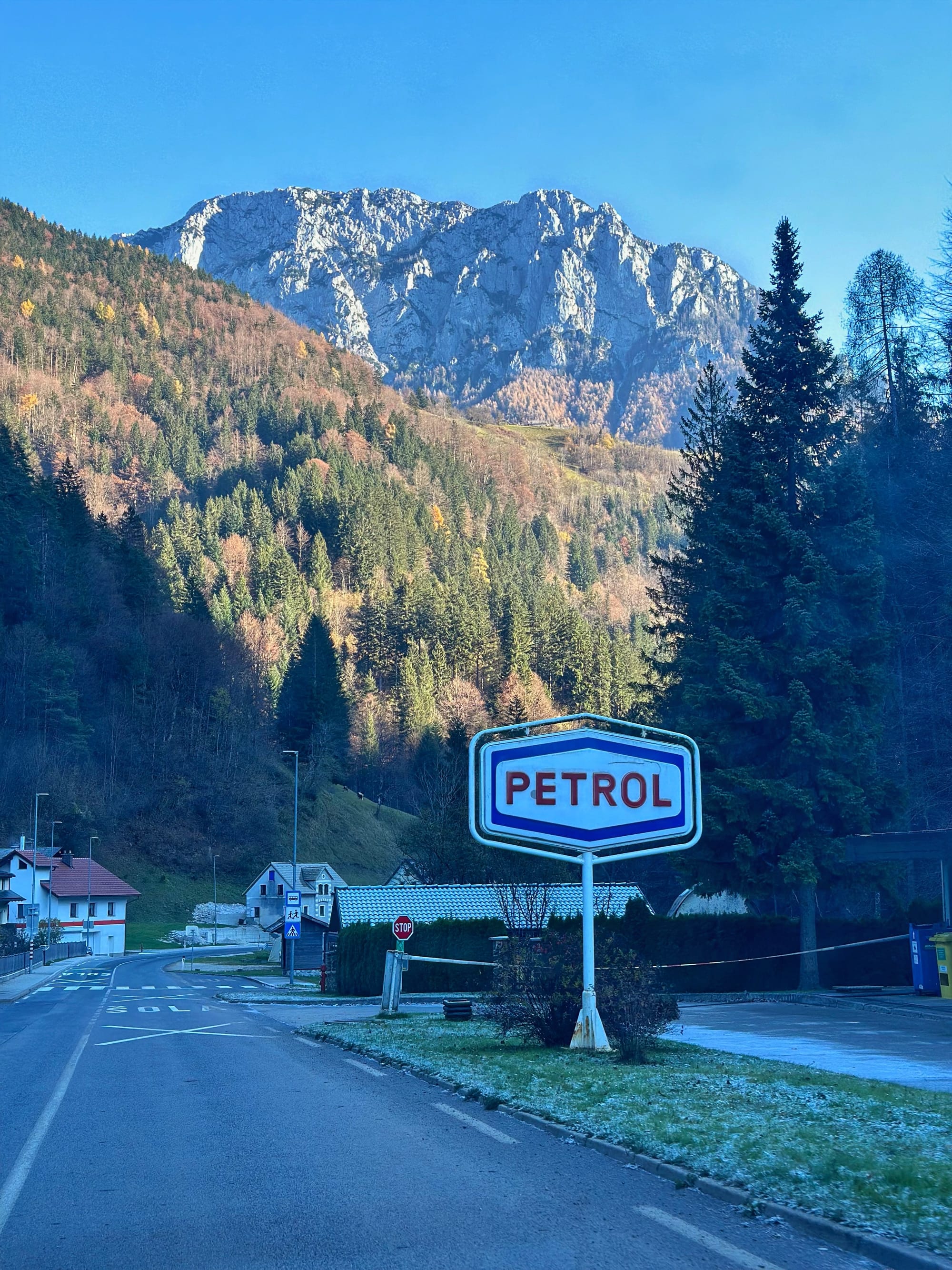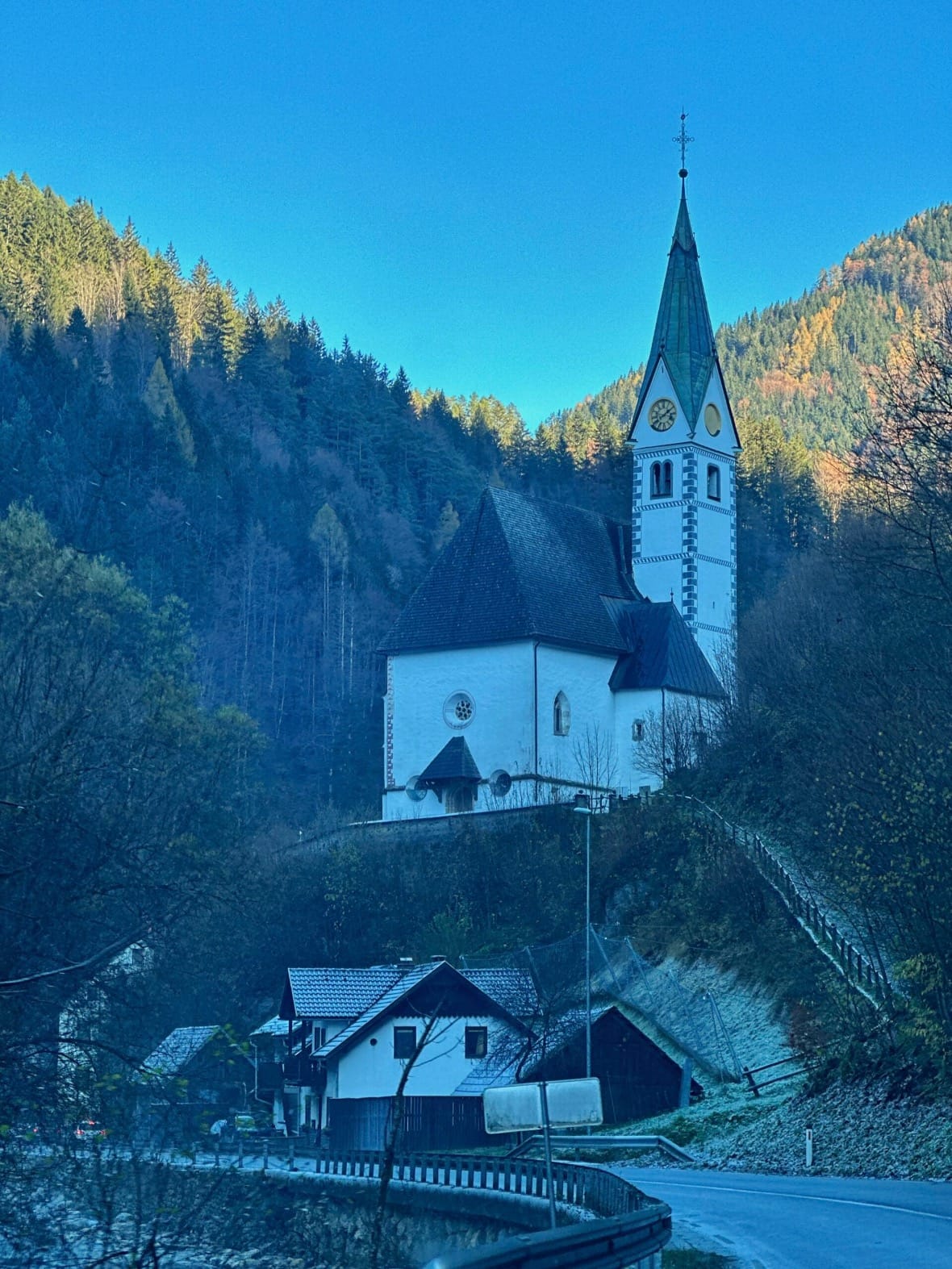 Vožnja prema Logarskoj dolini sama po sebi je čarobno iskustvo. Cesta prati rijeku Savinju, čija tirkizno plava voda posebno dolazi do izražaja pod suncem. Iskoristili smo priliku za kratki odmor uz rijeku i uživali u miru i tišini prirode. Na putu smo prošli i kroz mjesto Solčava, koje je cijeli dan ostalo pod mrazom jer sunčeve zrake nisu uspjele probiti planinske obronke – prizor koji dodatno podsjeća na ljepotu i surovost zime u Alpama.