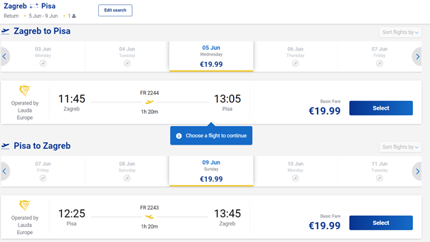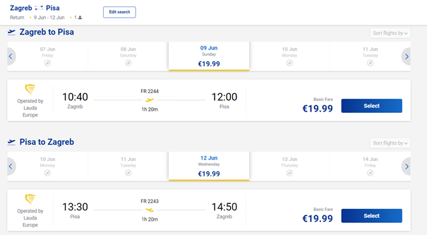Cijena povratne karte za let Zagreb – Pisa – Zagreb je ista i za slijedeće datume putovanja samo je razlika u vremenu leta: