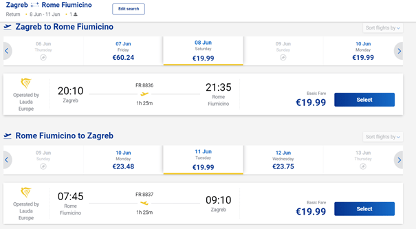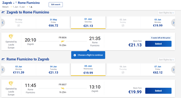 Iz Splita u lipnju jeftinije možete odletjeti samo u Rim i to po cijeni od oko 40€ za povratni let s ruksakom. Datum putovanja je 01.06. (subota) do 06.06. (četvrtak).