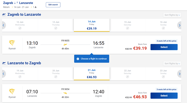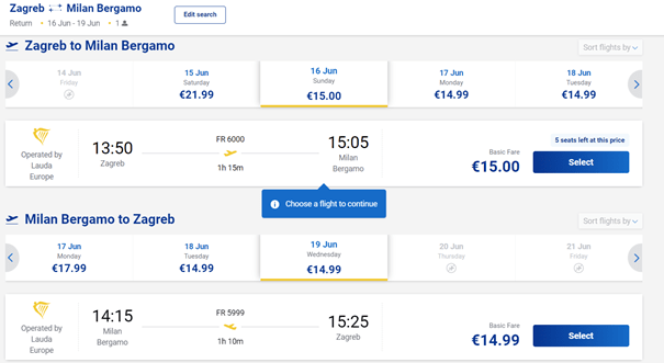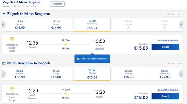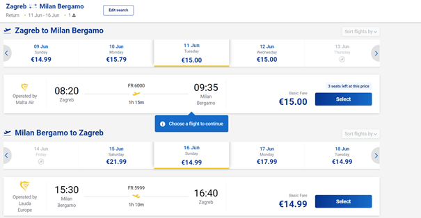 Cijena povratne karte je ista i za slijedeće datume samo je razlika u vremenu leta: