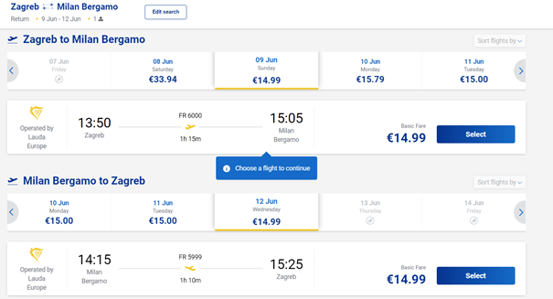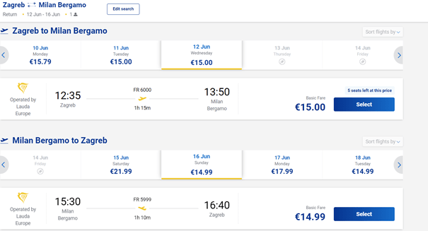 1.2. Povratni letovi po cijeni od 40€ do 45€