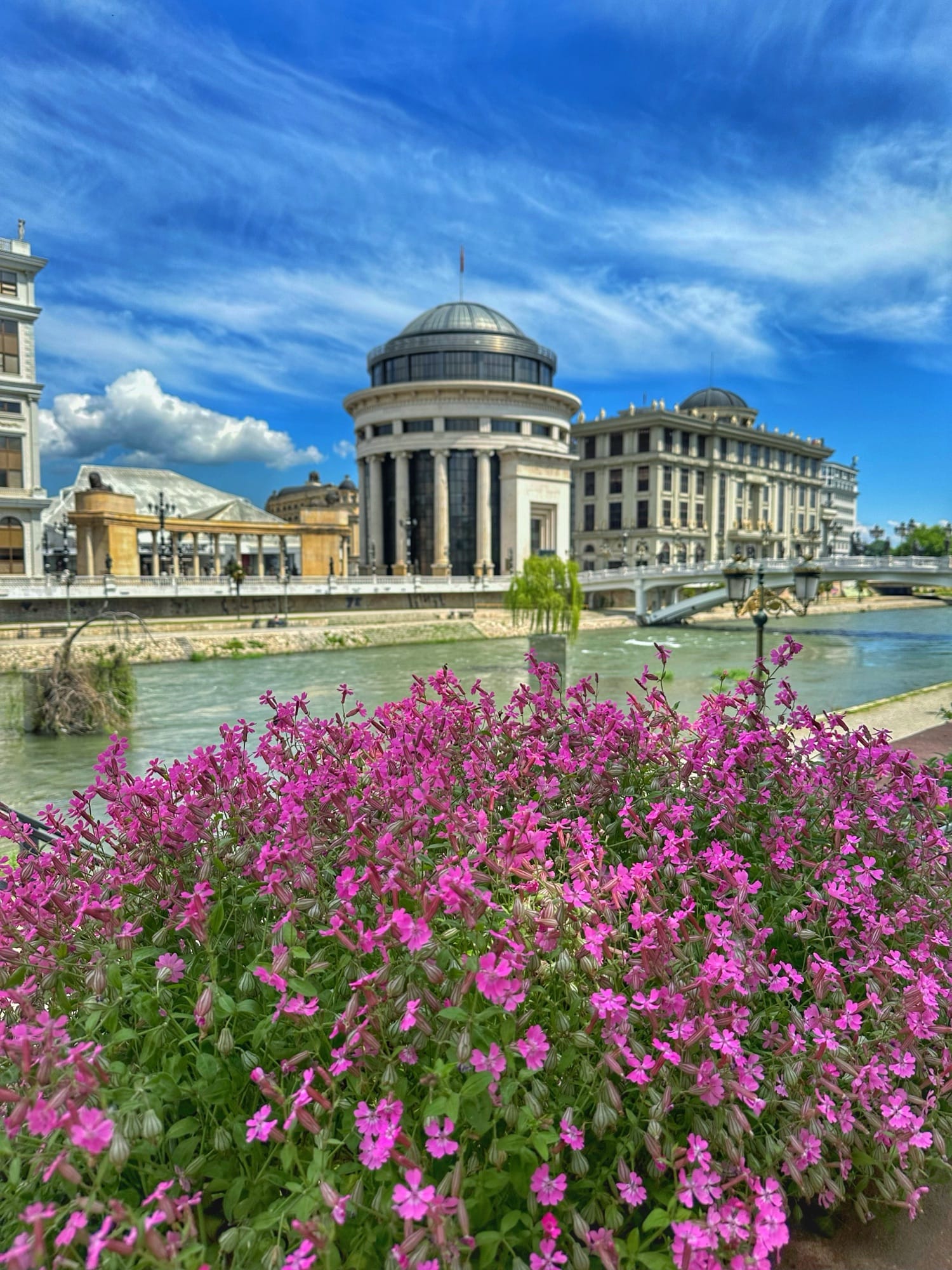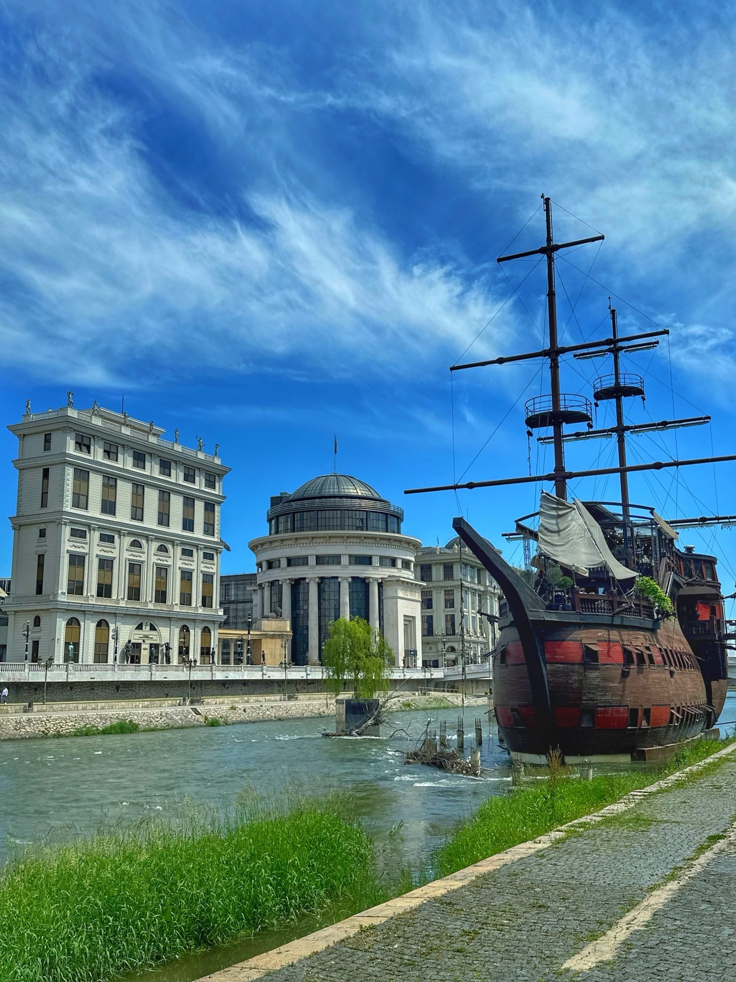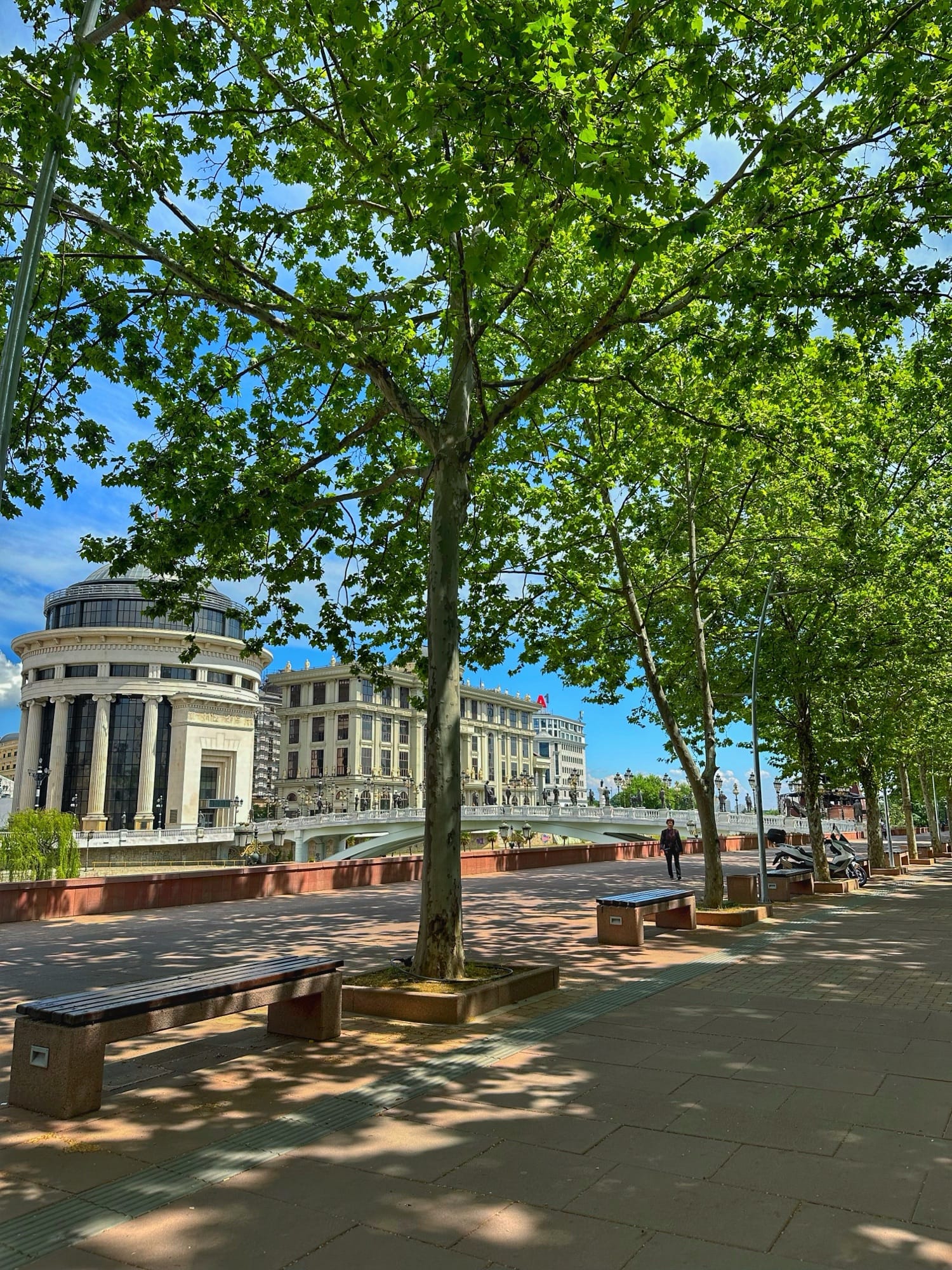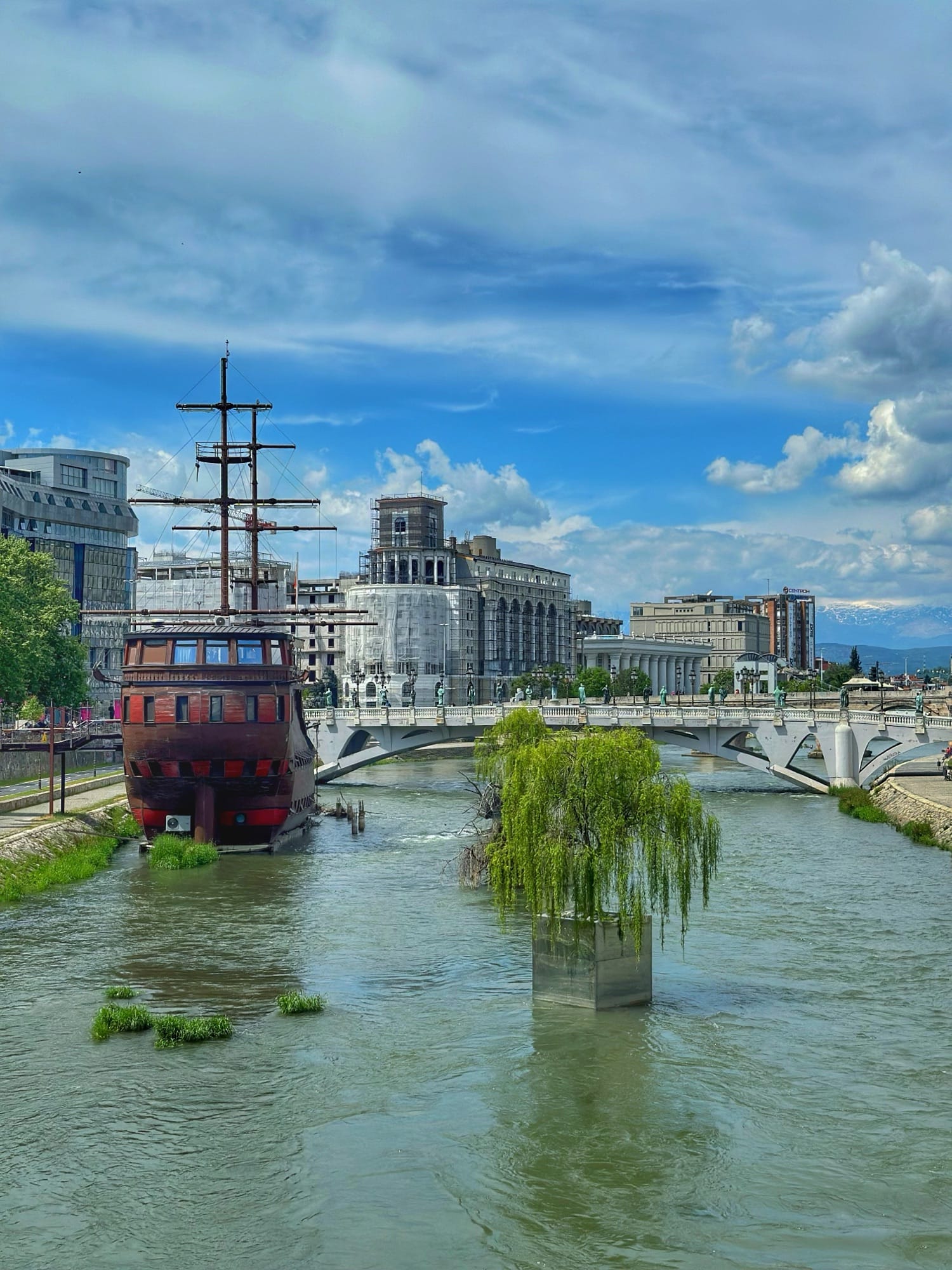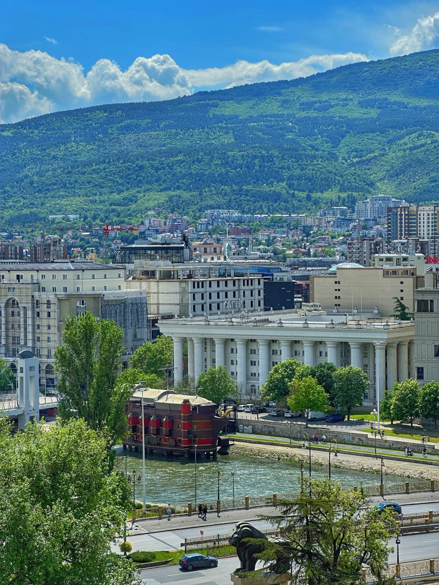 Sve to što ćete vidjeti uz obalu, kao i glavni trg, kopiju pariškog Slavoluka pobjede te kopiju Brandenburških vrata u Berlinu kod zgrade parlamenta dio su projekta Skopje 2014. Projekt je bio pokrenut 2010. godine, a sastojao se uglavnom od izgradnje muzeja i vladinih zgrada te podizanja spomenika poznatijim povijesnim osobama iz makedonske povijesti. Mnogima se ovo nije svidjelo te su Amerikanci dali Skopju nadimak "Las Vegas Balkana" ili "Disneyland Balkana" zbog velikog kiča. Šetajući gradom primijetit ćete crvene autobuse na kat iste kao one u Londonu, tzv. double-deckers.