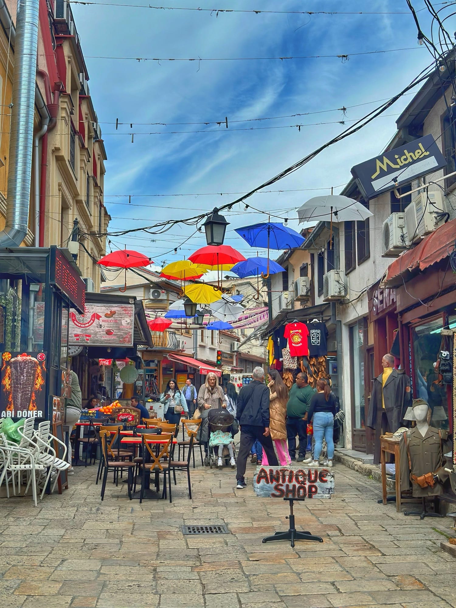 Obavezno se prošećite i Starom skopskom čaršijom. Pojedite fine ćevape u Sinoshiti minav ili u Kaj Goce. Cijena je 610 MKD (oko 10 €) za veliku porciju ćevapa, šopsku salatu, ajvar i kolu.