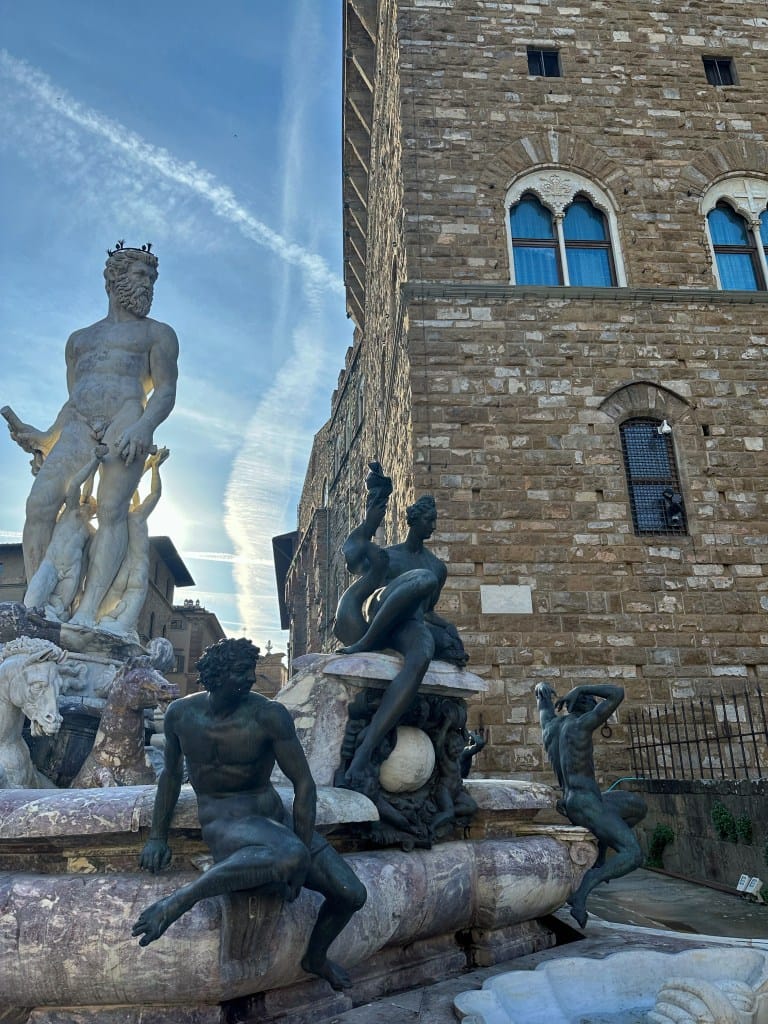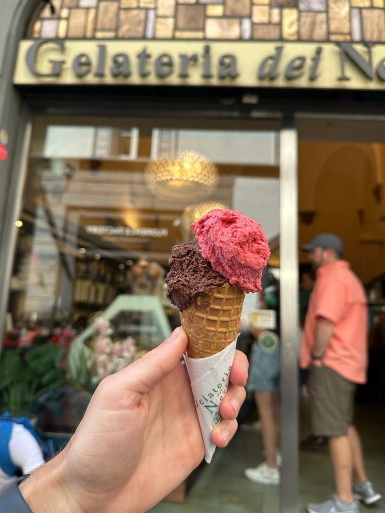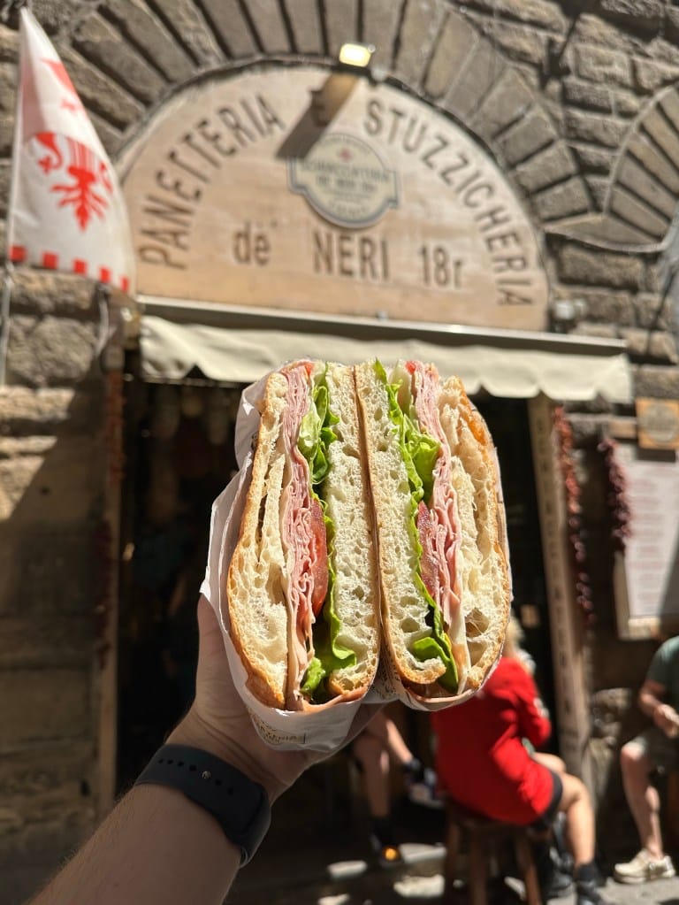 Šetnju nastavljamo do Piazza Signoria te Piazza San Firenza. Od tolike šetnje smo i ogladnjeli. Što drugo pojesti nego jednu tzv. Schiacciateria. Mogu se naći u ulici Via dei Neri. Najpoznatiji lokal je All’Antico Vinaio, ali tamo je Schiacciateria najskuplja. Topla preporuka je da ju uzmete u Panetteria e Stuzzicheria. Jednako je dobra, a jeftinija. Obavezno uzmite i sladoled u Gelateria dei Neri.