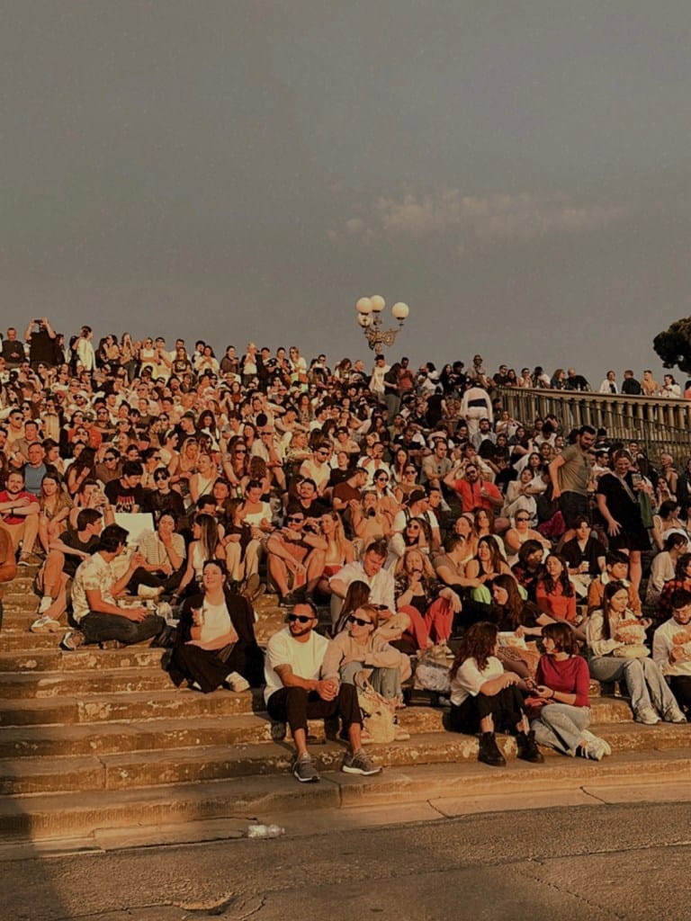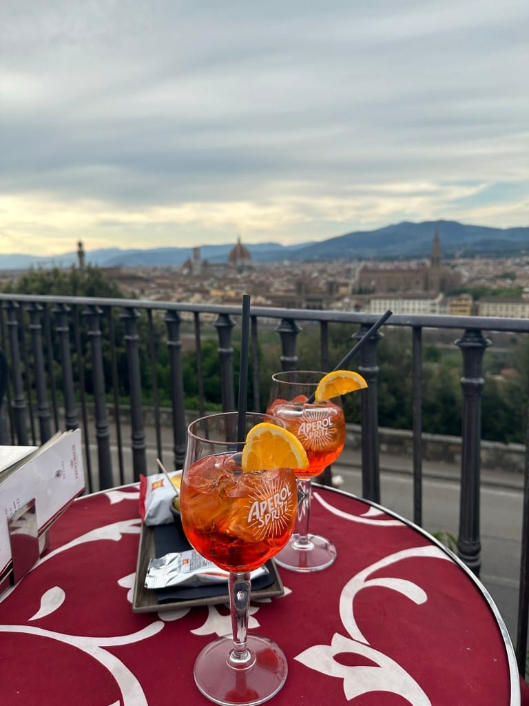 Odlučili smo otići do Piazzale Michelangelo s obzirom na to da smo znali da je od tamo neizostavno pogledati zalazak sunca. S trga se pruža predivan pogled na grad zato ni ne čudi hrpetina ljudi koja je bila na trgu, neki na stepenicama, a neki uz zidine i svi smo željno iščekivali taj famozan zalazak sunca. Usput smo popili i jedan Aperol u Vip’s baru koji se nalazi odmah pored stepenica. Malo smo čekali jer sam, kad sam već tu i kad ću Aperol platiti 10 €, htio biti uz samu ogradu pa smo morali pričekati da se stol oslobodi.