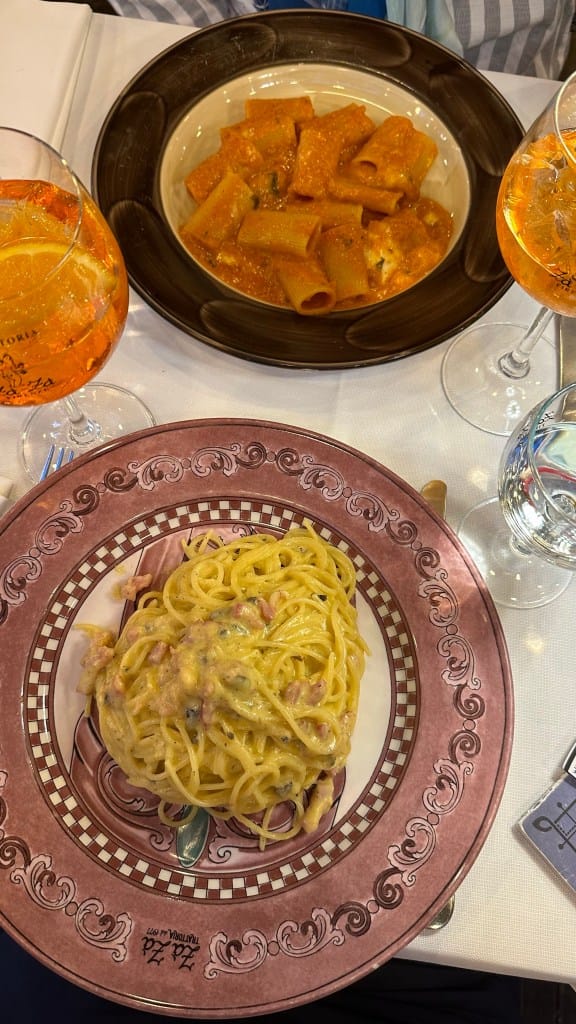 Nakon divnog dana, kako drugačije isti završiti nego jednom tipičnom talijanskom večerom. Otišli smo do Trattoria Zà Zà. Opet čekanje u redu jer je restoran dosta popularan te se mora malo, kojih 15ak minuta pričekati. Odlučili smo se za pastu, ja sam uzeo bolognese, naravno opet Aperol (već ne znam koji je to bio, ali znam da sam već lagano bio naaperoliran) i za kraj, jednostavno neizostavno, Tiramisu.