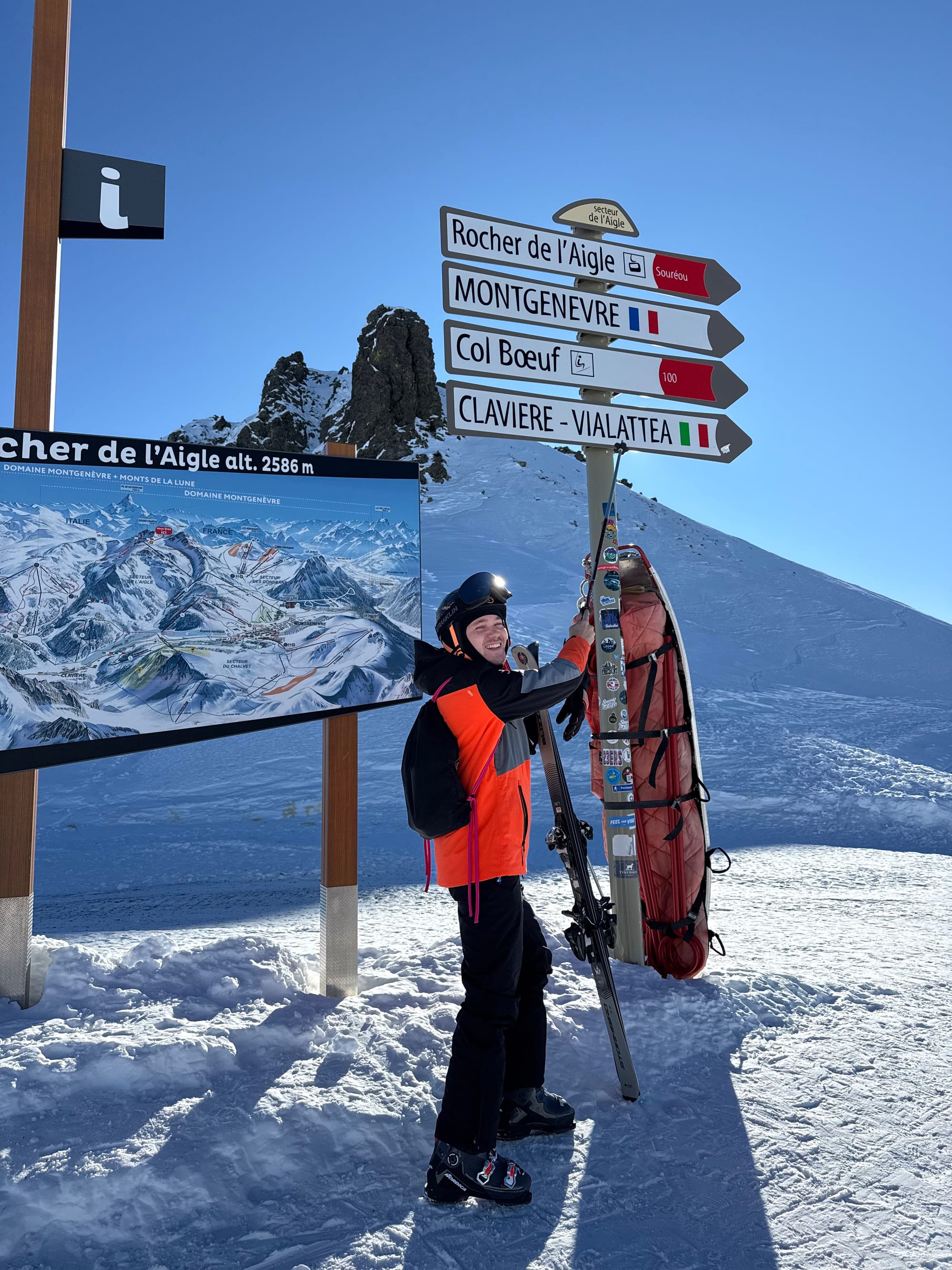 Montgenèvre je jedno od dva izleta na kojima smo bili u sklopu paketa. Nalazi se kojih pola sata vožnje, organiziranim autobusom, od mjesta u kojem smo boravili. Ovo skijalište ima dvije strane, jedno je posebno po tome što možete skijati do Italije jer je sve povezano stazama i ski passem. Oko kupovine ski passa ne morate brinuti jer je uključena u cijenu paketa putovanja. Ovo je jedno od najstarijih skijališta u Francuskoj po čemu svjedoči i jedna sedežnica na kojoj se bilo vrlo avanturistično voziti. Mala je i onako, vrlo zanimljiva. Nije me strah visina, obožavam adrenalin, ali mi nije bilo svejedno, pogotovo jer je malo puhalo i vozio sam se sam. No, bez obzira na to, ovo mi je bilo najdraže skijalište i jedan od boljih dana cijelog putovanja. Pogotovo jer smo skijali do Italije i tamo popili jedan latte macchiato, pojeli tiramisu i cheeseburger jer bio 11€, znatno jeftiniji nego u Francuskoj. E i da, skijali smo preko mostova, prefora. A kako doći do Italije? Krenite od sedežnice Chalmettes, zatim do vrha nastavite s gondolom Rocher de l'aigle. Kada stignete na vrh, krećete se spuštati prema desno u smjeru Claviere-Vialattea i odmah pri prvom račvanju desno u smjeru Voie Lactee. Skijajte do planinarskog doma Rifugio Baita Gimont gdje možete uživati u prethodno spomenutim finoćama. Izlet je trajao od pola 9 ujutro do 16 sati, stoga je bilo vremena za cjelodnevnim skijanjem.