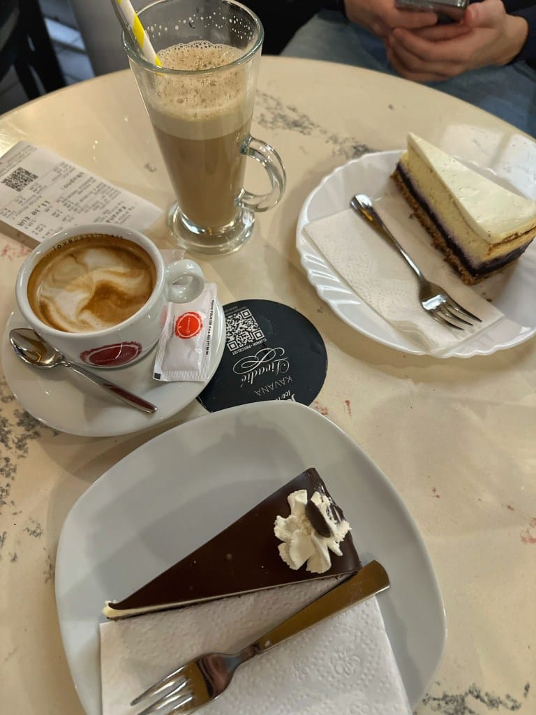 Pojedi nešto fino u Arra Pizzeria & Burger Baru. Klopa im je super. Prije 2 godine jeo sam wok, a sada sam se odlučio za grčki burger. Koštao me 9 €, a dodatnih 3 € odvojio sam za pomfrit. Nakon ručka otišli smo na kavu i kolače. Odmah pored restorana, na glavnom trgu ima mnogobrojnih kafića na čijim terasama možeš uživati u zrakama sunca, upijajući vitamin D. Mi smo se odlučili za dobro poznati Livadić, ali ja nisam uzeo kremšnitu već čokoladni kolač. Nisam baš najveći fan kremšnita.